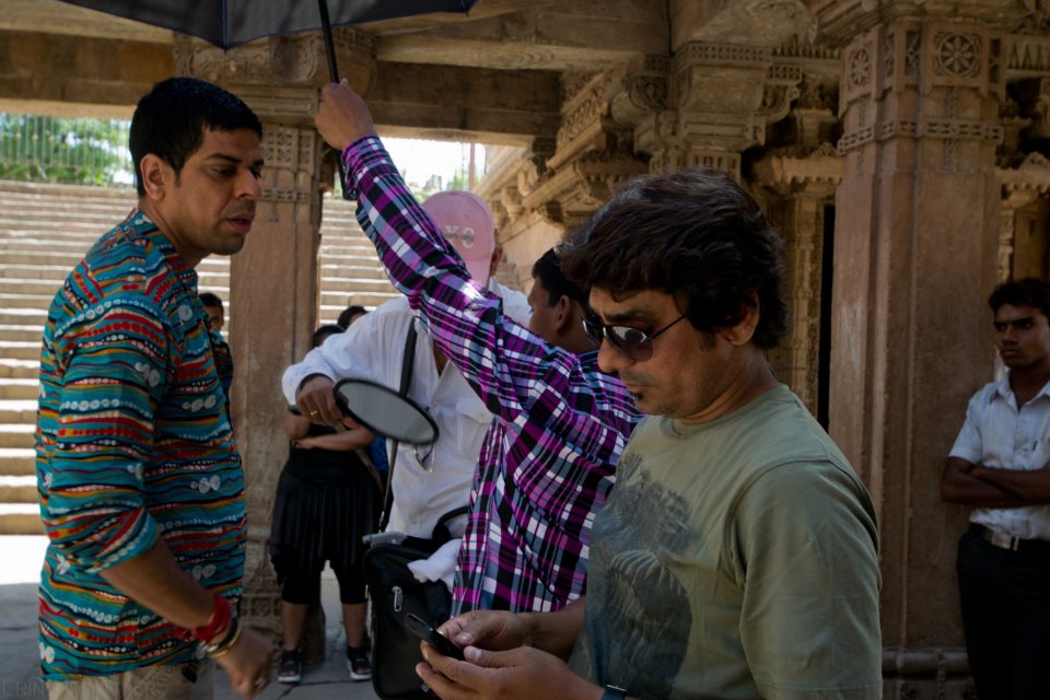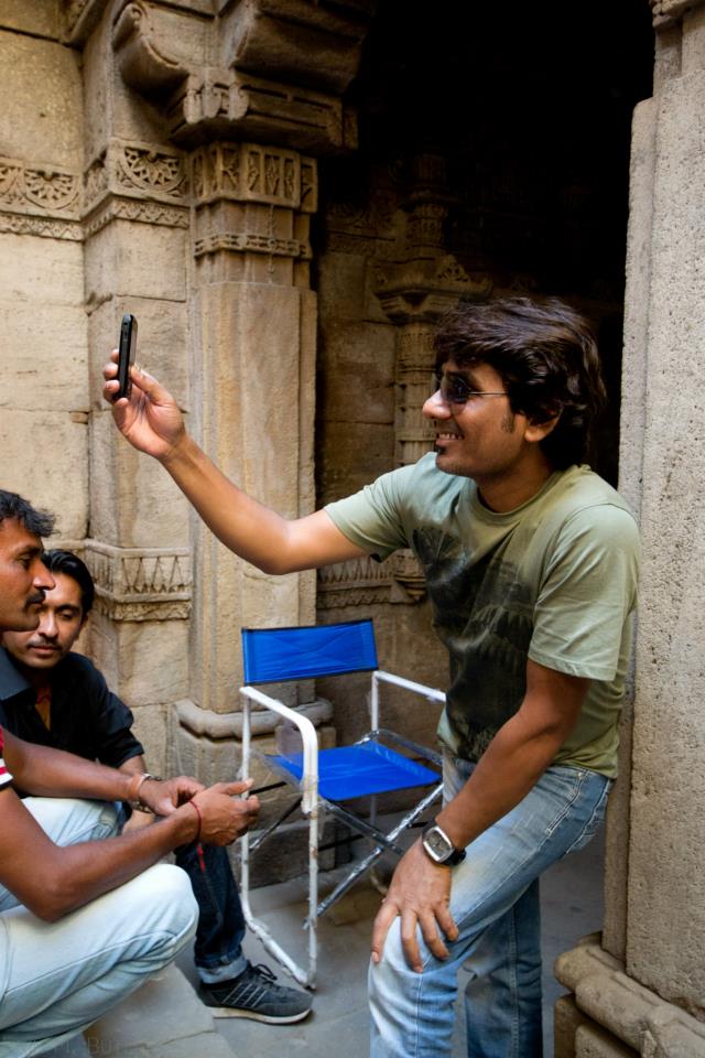 Chandresh on the phone at the shoot.  The star is in the blue shirt. Shooting was  at Adalaj Ni Vav step well near Amedabad.