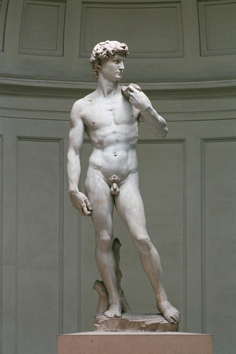 Michelangelo, a Florentine artist , prominent painter, and sculptor of the high Renaissance in the 16th century, created this David. He chose to depict the instant when David first turns his head to see Goliath in all his miserable splendor. Michelangelo’s Renaissance style of idealism emphasizes his great admiration and awe to detail of the human body. The original David is on display at the Galleria dell’Academia in Florence , and a copy stands in the Piazza della Signoria in the original site for the statue. The original has been moved inside to protect it from the weather.