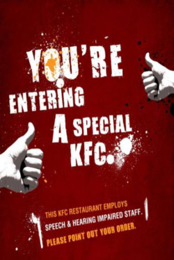 2 years ago I ate at this KFC ( I was curious what was on the menu of a vegitarian KFC). Any ways for 2 years I didn’t know why I had to order with finger pointing and I wondered why no one spoke to each other in the restaurant. I am very happy to find out why today.