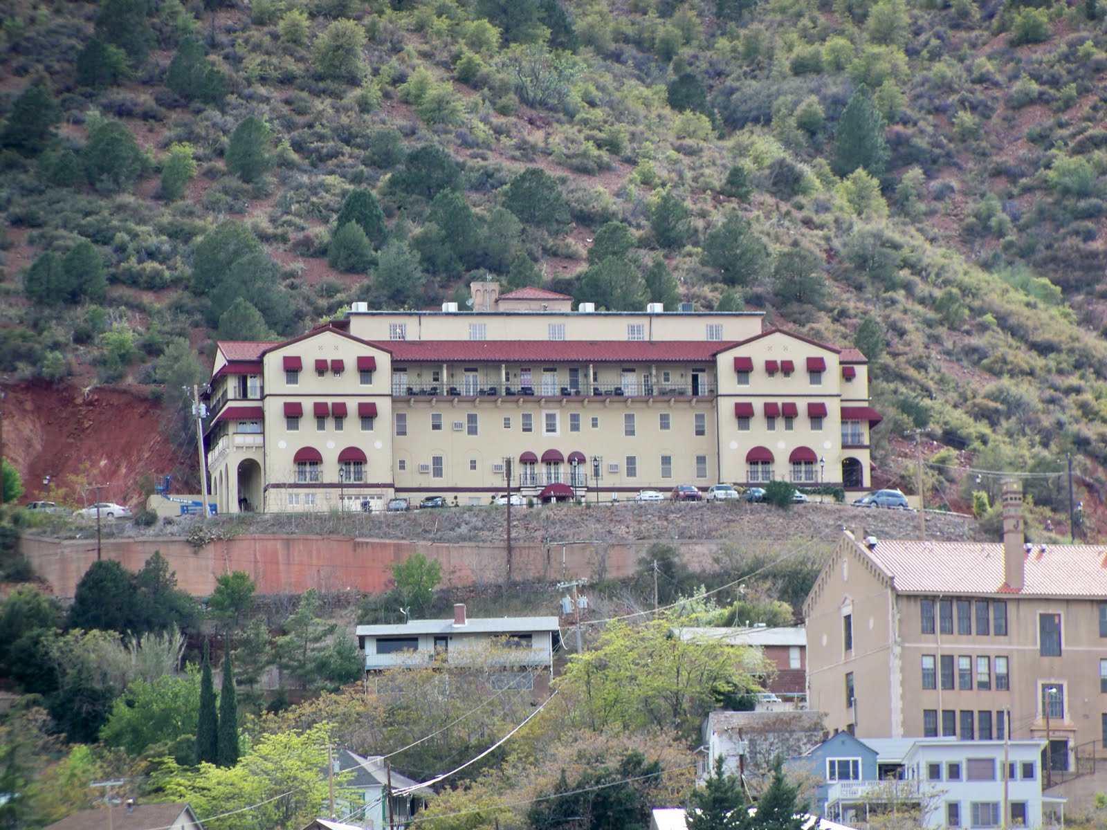 Arizona…I was there from 2005-2012, living in Gilbert and teaching in Mesa. I lived near and then with my son and his family. I would never imagined this adventure without their sweet support . Back to Jerome. . . . .I am posting this today because the horrible fires are burning near  there , near Jerome, during the spring season.  This happens very year.  100_1313   Here is the Grand Hotel , the queen of the town perched high on the side of the mountain. We stayed there for a couple of nights and we were not visited by any ghosts. This building was constructed as a hospital to care for the injured  mine workers either for copper and later gold mine. From the size, you can imagine the scope of this industry. images (8)