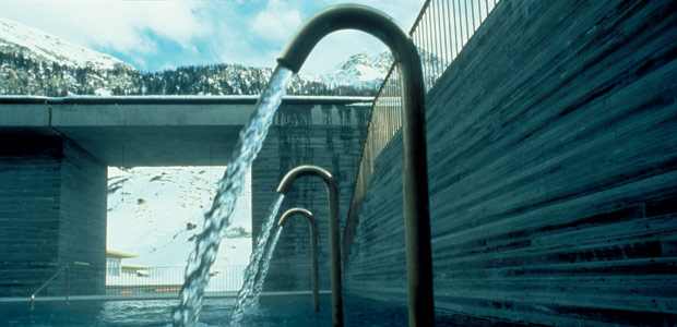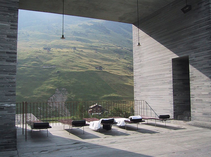 The stone used by Peter Zumthor, the Swiss architect, is mined from the mountains and used inside and outside the thermal baths.
