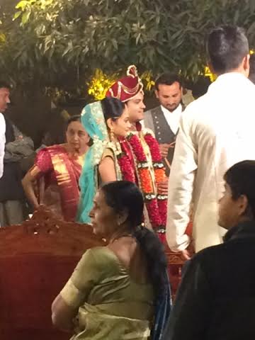 Here is one pair of waitstaff passing juice and water to the seat guests. There is no alcohol at Hindi weddings. Notice the helper’s celebratory turban. We sat waiting for the bride and groom to make their entrance. First came the bride. . .