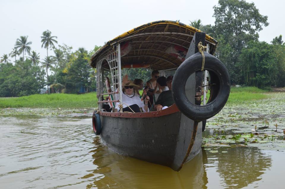 An interesting fact about Kerala is that it is the only elected Communist local government in all of India.  It was amusing to Dbell and me that the students wondered what the red flag with the sickle on it was!  There was a boat captain and crew strike for higher wages the day we were to go for this ride on the backwater canals.  Fortunately for us ,the hotel had two small boats and we didn’t miss this great adventure and because of the strike, we pretty much had the lake and canals all to our selves.  Riding along we saw Mango Trees, and  cashew trees as well as spectacular palm trees.   That was so interesting  on the cashew trees, was  the inedible fruit with the nut in a shell growing from the bottom of the fruit. We were in Aleepy and there is another city called Cochin where the airport is.  It is a small city by Indian standards of only a few million.  Dbell said that they may shoot themselves in the foot with all these taxes on the tourists. It is a lovely place but so is Goa. The three taxes on our hotel, food and everything we bought were higher than New York City tourist taxes!   Isn’t that amazing?