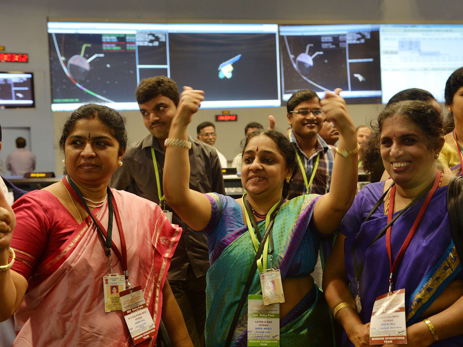 Indian staff from the Indian Space Research Organisation (ISRO) celebrate after the Mars Orbiter Spacecraft (MoM) successfully entered the Mars orbit at the ISRO Telemetry, Tracking and Command Network (ISTRAC) in Bangalore on September 24, 2014. India became the first nation to reach Mars on its maiden attempt September 24 when its low-cost Mangalyaan spacecraft successfully entered orbit around the Red Planet after a 10-month journey. “India has successfully reached Mars… History has been created today,” a jubilant Prime Minister Narendra Modi said from mission control after entry into orbit was confirmed at 8:02am (0232 GMT). AFP PHOTO/Manjunath KIRANManjunath Kiran/AFP/Getty Images