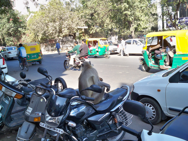 I took this picture! This huge male monkey was resting on the motorcycle just outside the neighborhood Jain Temple . I have no idea what happened when the human returned but monkeys are treated with great respect!