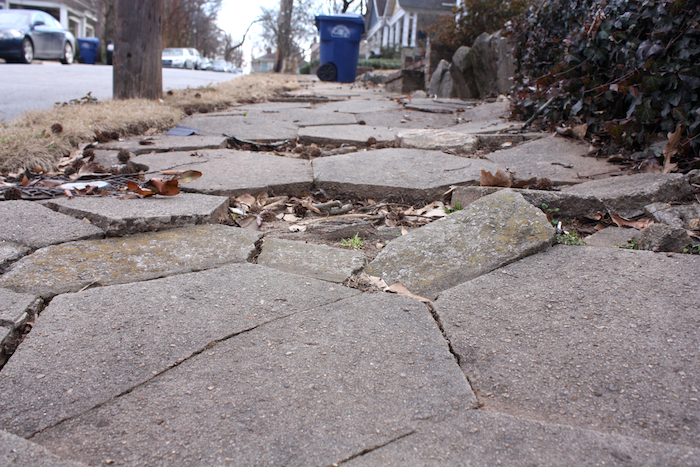 The roots of the trees are often very near the surface and press the sidewalk up as they expand.